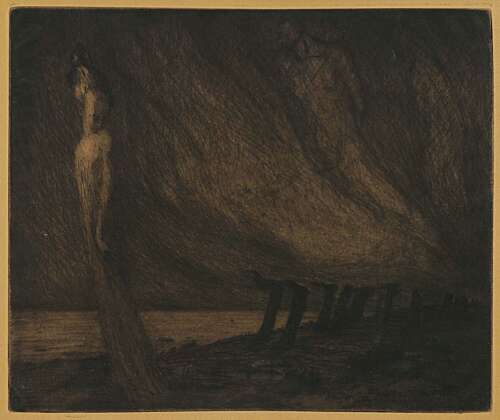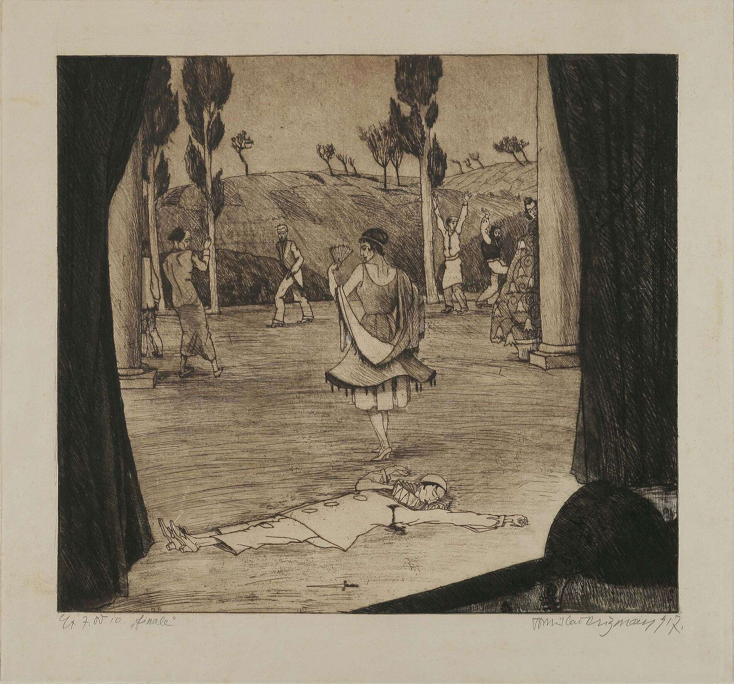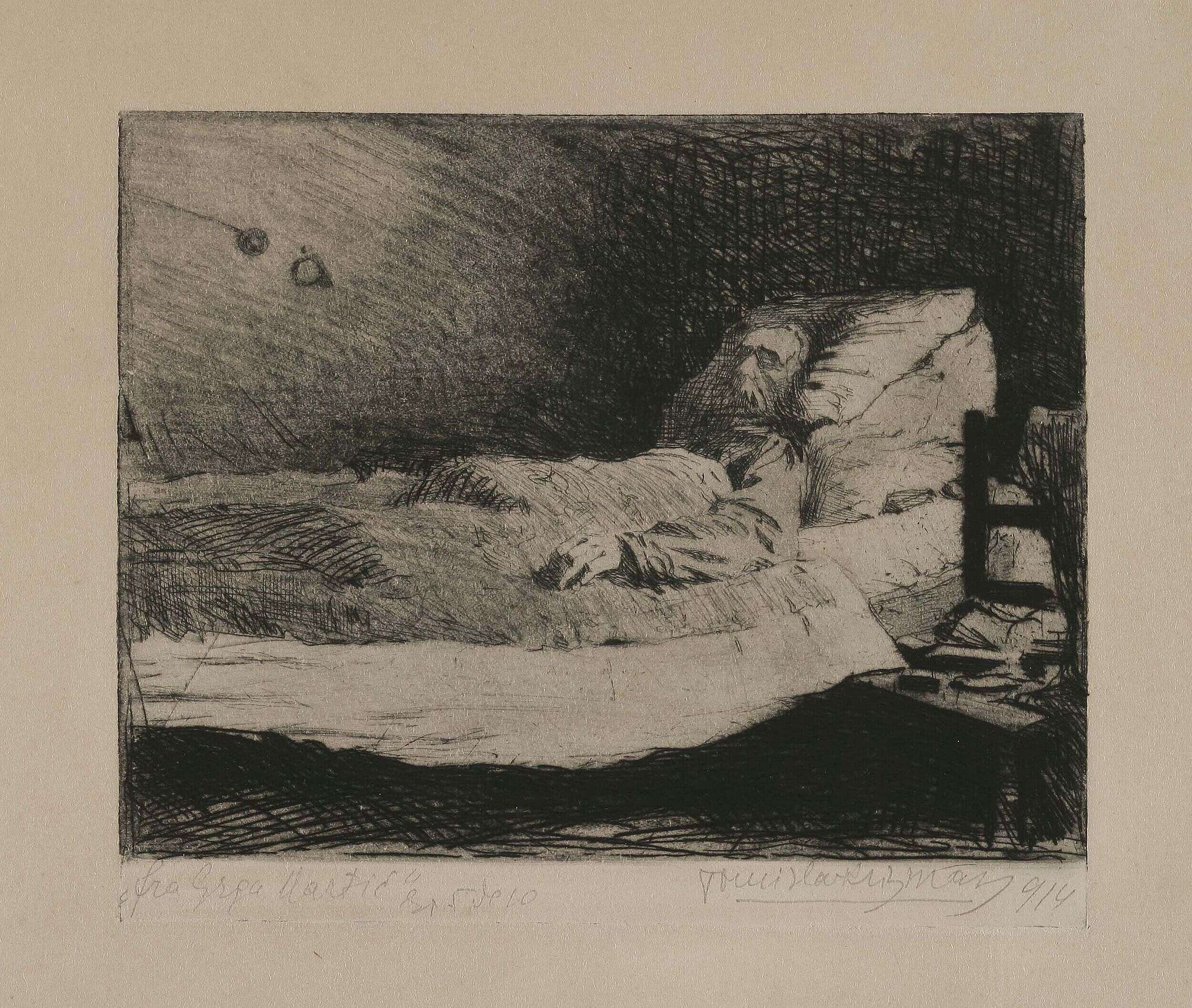 Krizman polished the basics of painting and print, acquired from Auer, Csikos-Sesija and Crnčić during his training in Zagreb, in Vienna under baron Myerbach at the School of Artistic Craft (1902-1905), after which he enrolled in the specialist study of printmaking at the Academy of Art under William Unger (1905-1907). His ten-year sojourn in Vienna (1902-1911) was the most fruitful period of Krizman’s artistic development, which made an impact on his original stylistic tendency, i.e. Art Nouveau orientation. Among Viennese avant-garde art and literature elite, as a regular visitor of current exhibitions and a participant at exhibitions in Hagebund, Jungbund, Künstlerhaus and Secession, Krizman, unhindered by institutional and teaching authorities, having adopted the painting and printmaking doctrines of Myerbach and Ungar, embarked on the Art Nouveau tidal surge which unrelentingly pervaded Central European cultural ambience. Krizman embraced Art Nouveau premises, united under the motto “symbol, decoration, expressive power”, as it clearly corresponded to his artistic disposition. Krizman’s finest print works were made in his Vienna studio and are today already so deeply ingrained in collective memory as anthological examples of universal morphological and stylistic solutions. Influences of his teachers are clearly discernible in the prints made during this period, most of all in the implementation of Ungar’s academic rules of etching and Crnčić’s atmospheric ‘documentary prints’, although Krizman imparted a more personal, powerful, elongated and restless trademark stroke on his prints. In the stimulating Viennese ambience Krizman became acquainted with the proclamatory pieces of the Art Nouveau movement; the Klinger-Klimt-Hodler creative solutions and Kokoschka’s expressionist soars must have remained deeply etched in his memory. Even critics admitted he had managed to absorb the influences he was exposed to, but at the same time also to secede them from his own prints and hence establish a personal creative morphology.