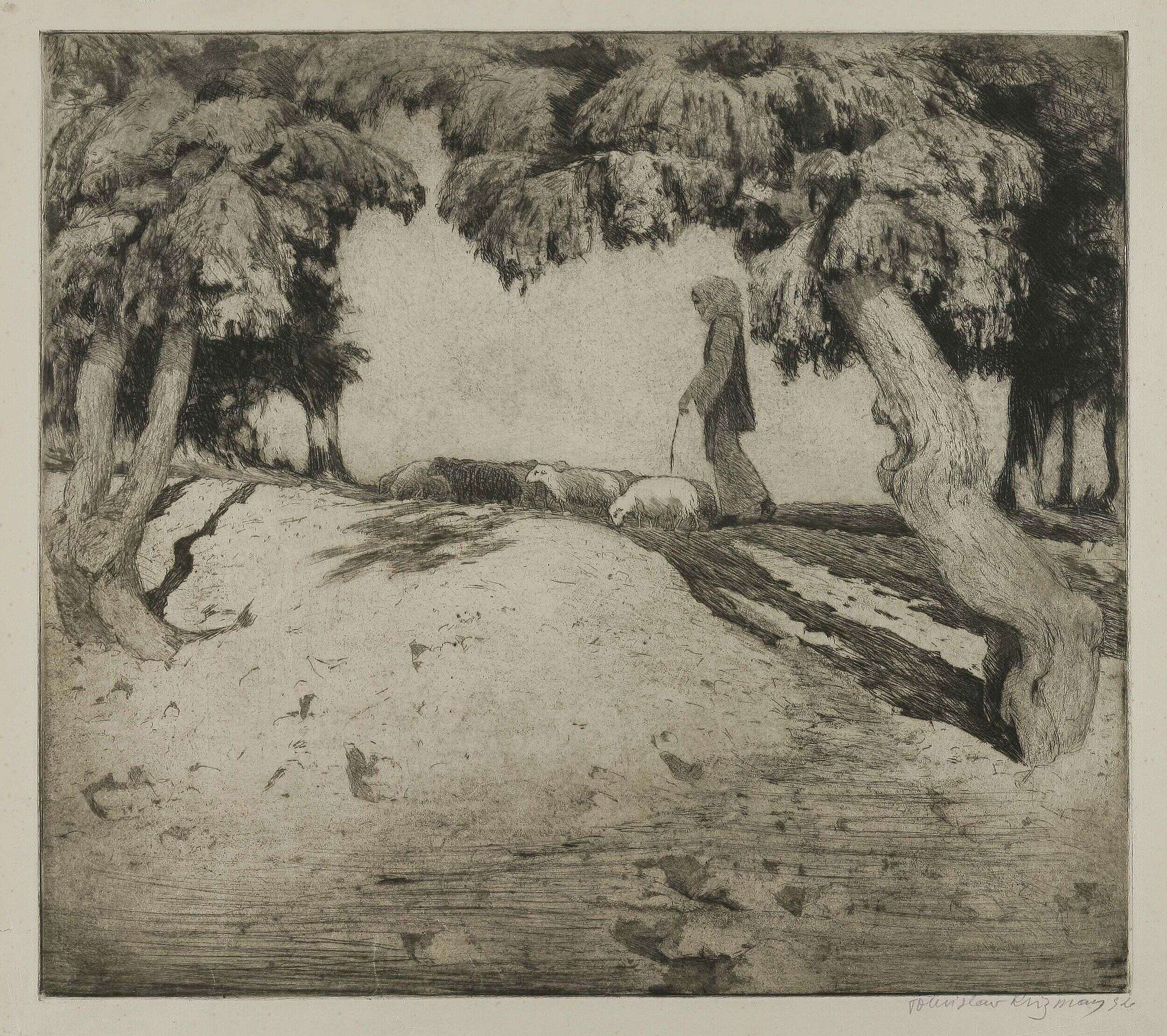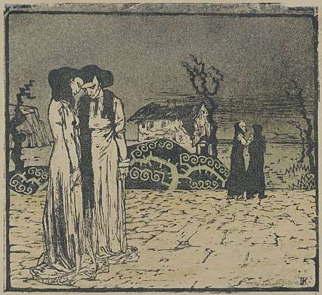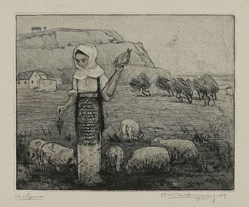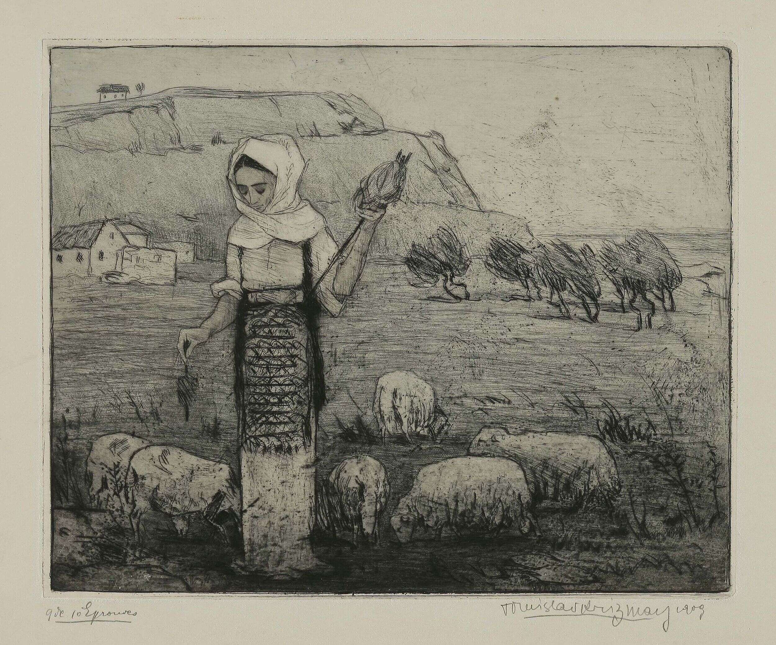 Around the time of the establishment of the Medulić collective, Krizman abandoned the linear Art Nouveau stylisation and started creating in the wake of Medulićesque symbolism and return to folk myth, the history of his nation and general striving to revival. Therefore, in line with the tendency, elements and colours of folklore can be traced in several of his works (Dalmatian Shepherdess, Return / Shepherdess), although he applied ethnic ornamentation more on his applied art and design works. After a health condition caused by paints (J. Draganić, 1934: 10), Krizman abandoned painting and turned even more passionately to the printmaking medium, demonstrating enviable metier prowess and stylistic diversity. He gathered his broad range of topics on his sporadic journeys to Zagreb, Dalmatia, Bosnia, Belgrade, Munich, Paris, Italy (Mostar Bridge, Willows on the Sava, Venice / Entering Canal, Nocturnal Street / Bosnia, Friar Grga Martić on his Catafalque, Finale, Snow-covered Hillside Street.)