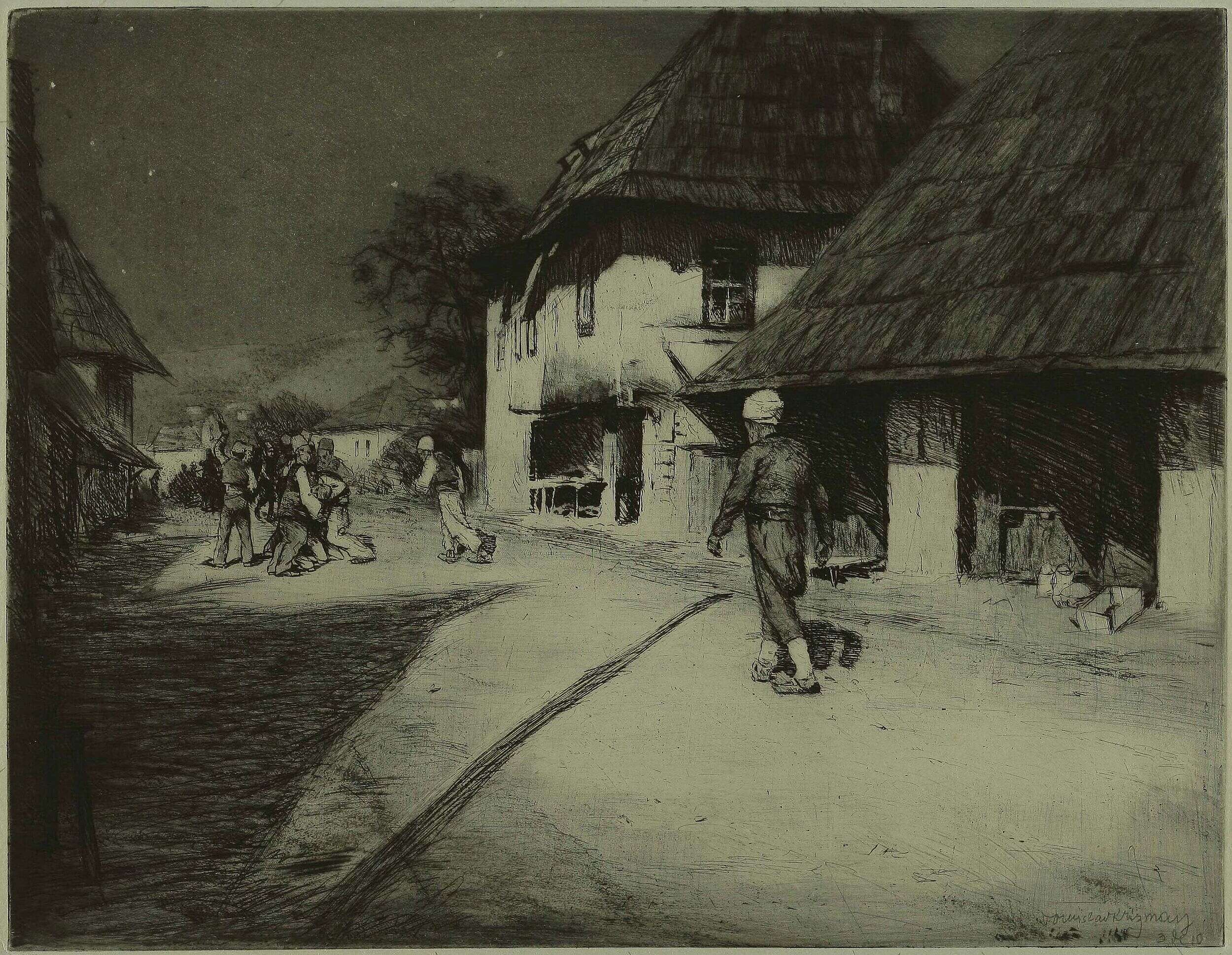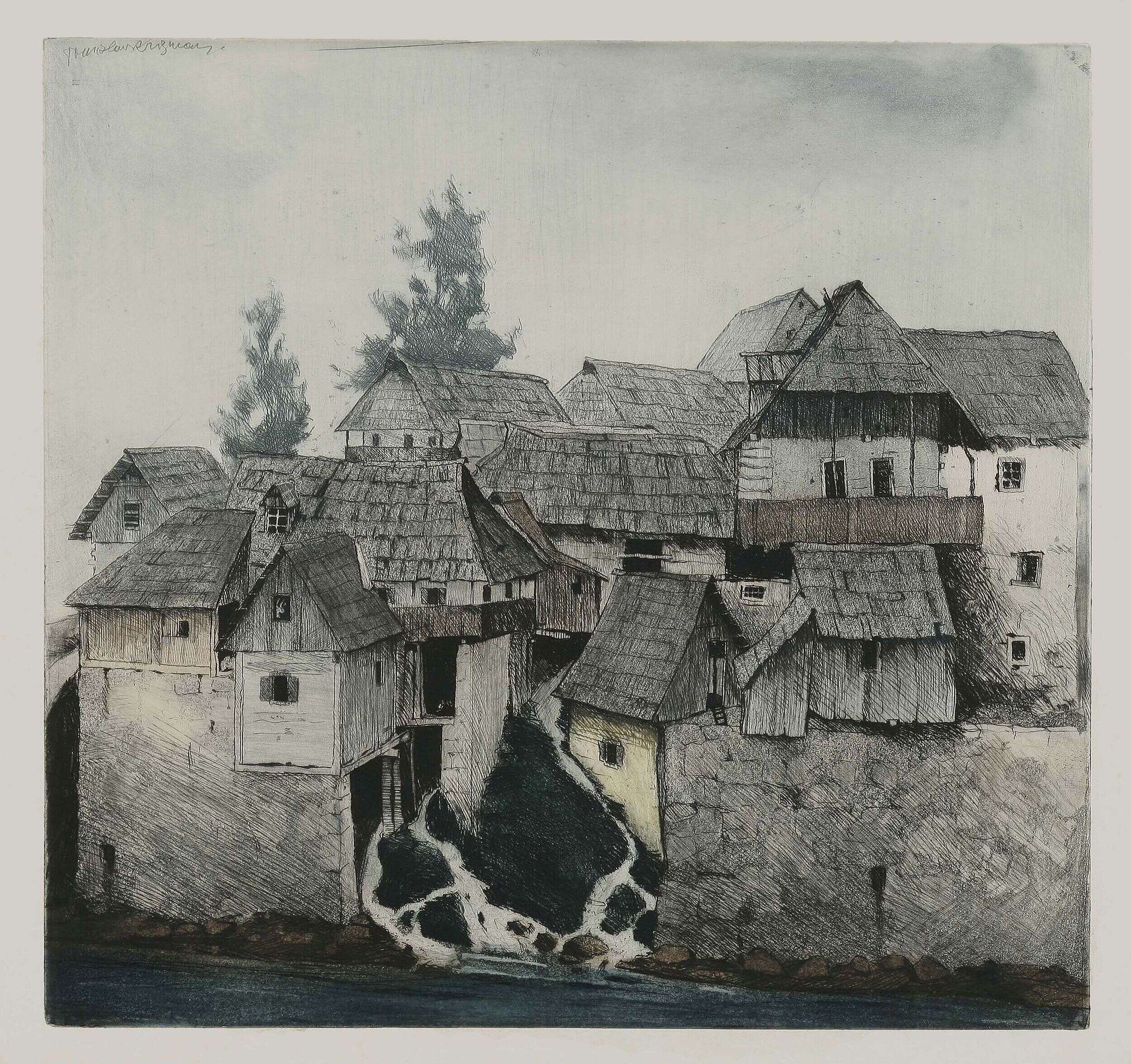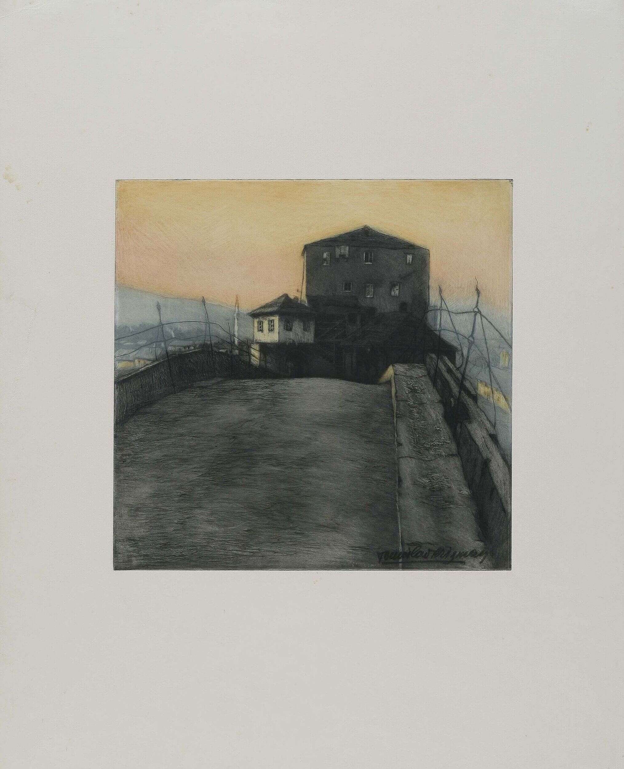 After the Balkan wars (1912-1913) Krizman travelled to Serbia, Macedonia and Kosovo and photographed[13] and “registered his experiences of landscapes, monuments of medieval Serbian and Macedonian architecture, urban and rural parts with bazaars, bedestens, mahallahs and charshias as a thus far unknown, idiosyncratic world. (…) He processed the registered motifs in different graphic techniques – woodcut, etching, engravings, monotype and lithography – where his sense of decisive line cutting yielded solidly composed and condensed units. He loved dark outlines and dense surfaces in the foreground, which turned lighter and lighter in each new ground to the point of sophisticated fading in faraway depths. His technical mastery in processing metal plates was unsurpassed.” (S. Batušić, 1954: 8) He later re-evoked and re-processed these absorbed impressions, albeit in a somewhat freer expression, in his large (1917) and small (1918) portfolio Macedonia.