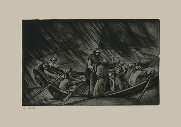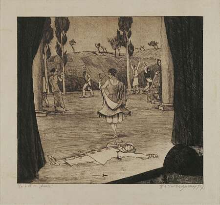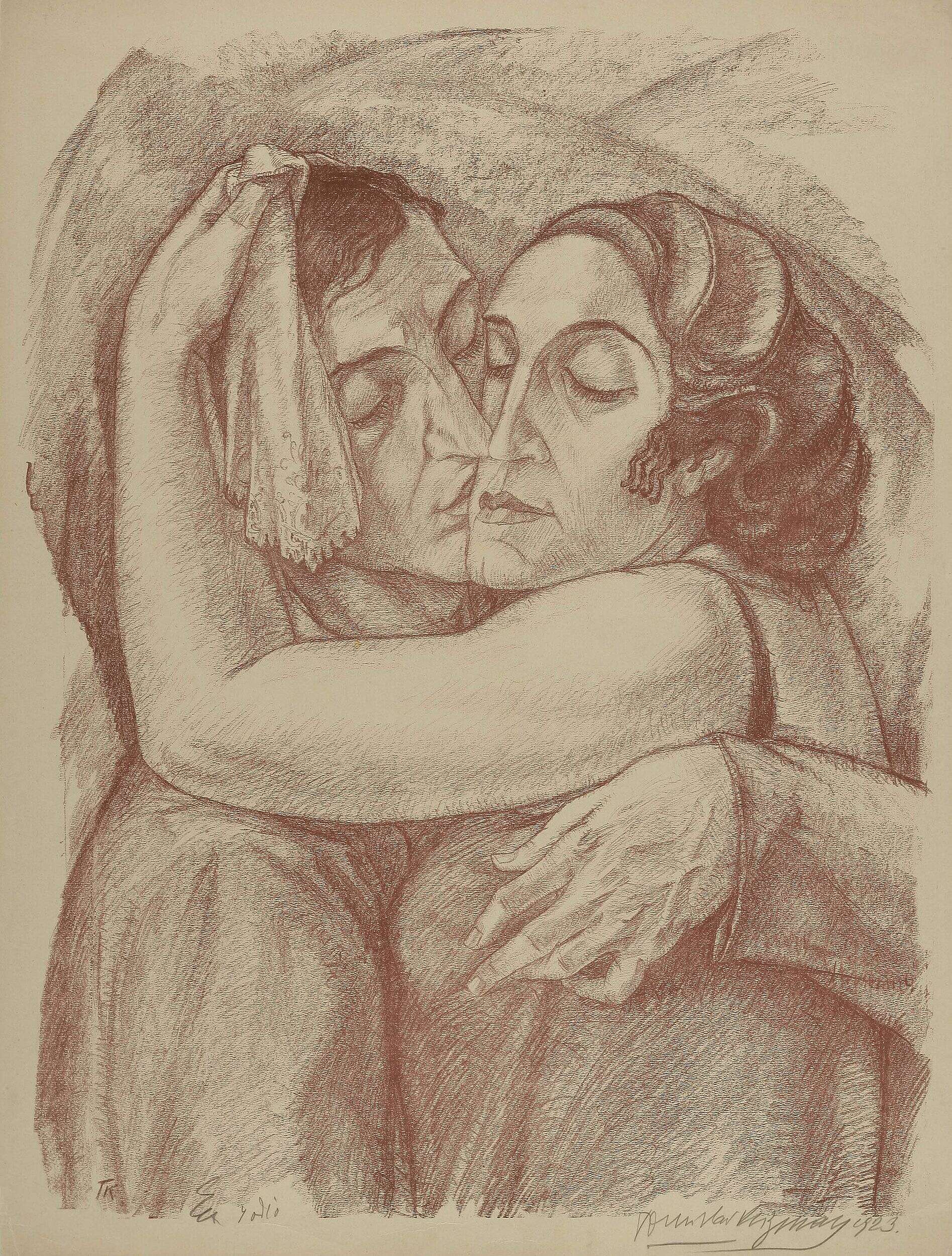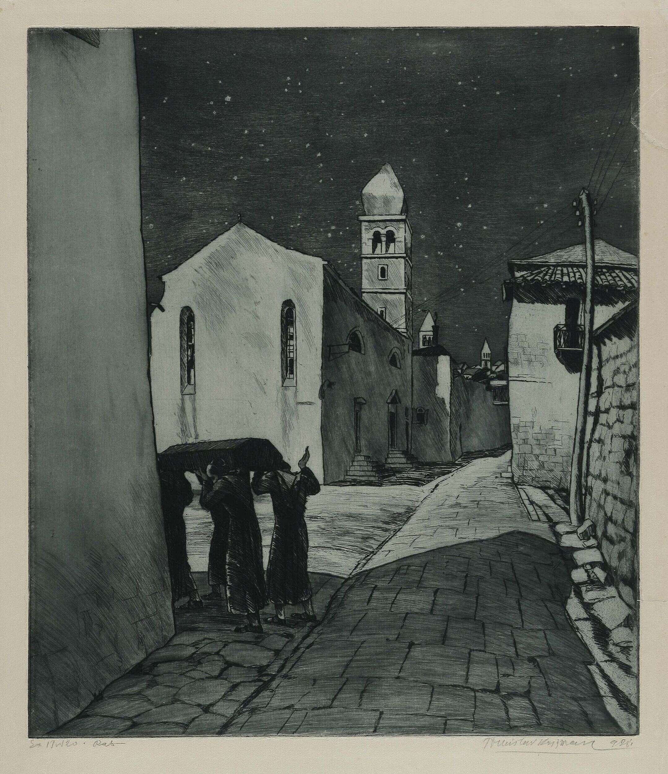 The Spring Salon expressionism in the 1920s only glanced him off. A certain penetration into expressionist trends was visible in the lithographs Madonna with Child from the Spring Salon portfolio (1920) and Kiss, as well as etchings Christ on the Lake and Funeral in Rab, which already took a step away from his much-loved routine subjects, although technically perfect: urban and rural vistas (Slunj).