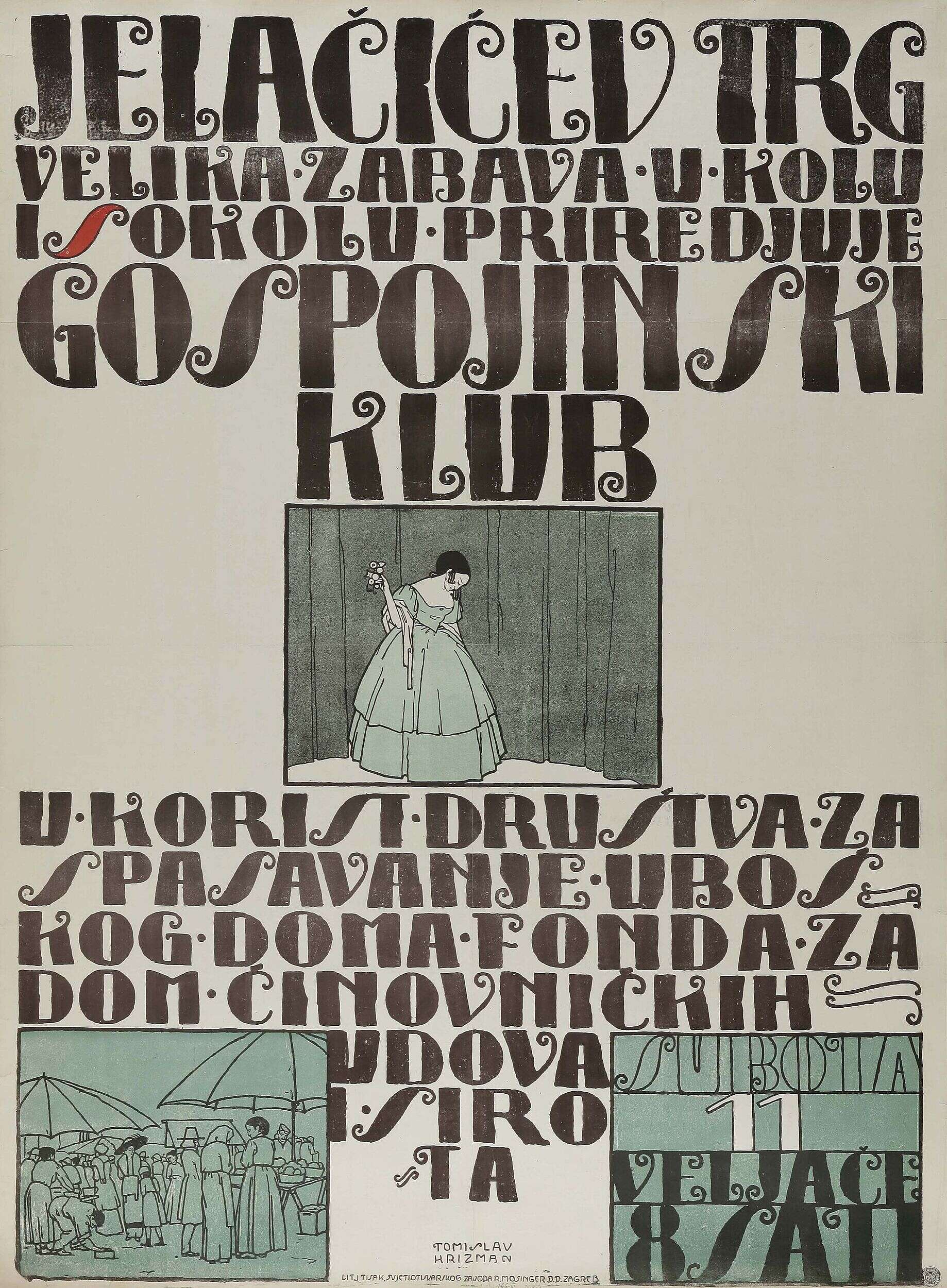 Krizman’s lithographic posters consistently follow the Art Nouveau principles of graphic design, respecting the given two-dimensionality of the surface onto which the author applies the drawing of accentuated outlines and asymmetrical placement, surrounding it with condensed capital letters, creating an ideal combination of style and expression, of image and text[8] (Marya Delvard, Tkalčić-Gruss Concert, Large Party at the Lady’s Club, ‘Old Border Guard’ Liqueur).