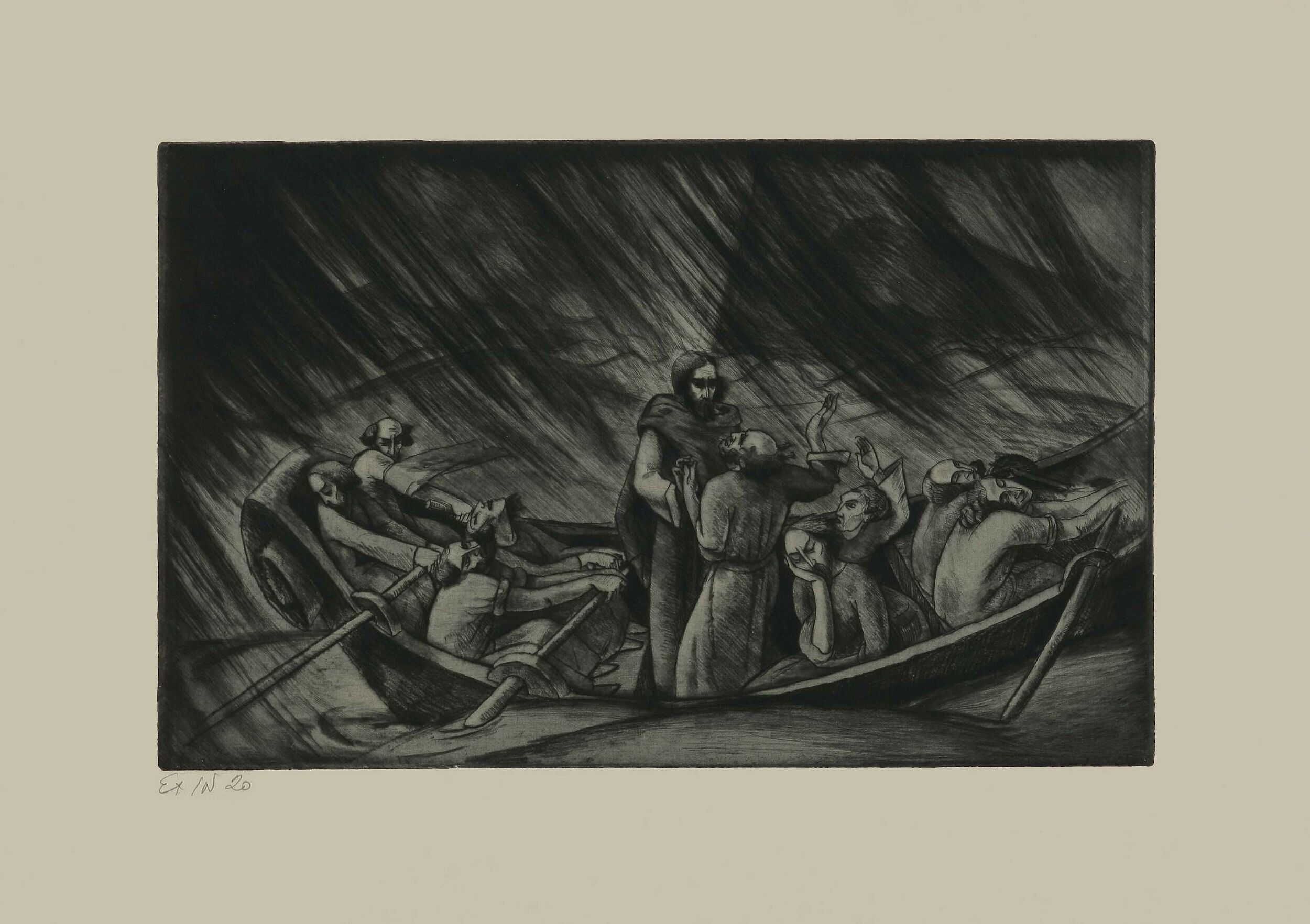 Krist na jezeru Grafička antologija Tomislava Krizmana / iz fundusa Kabineta grafike HAZU ← Cjelov / Zagrljaj / Ljubavnici Pogreb na Rabu → Krist na jezeru, (1927.) bakropis, suha igla 302 x 478 / 535 x 760 mm; bütten-papir sign. nema; ispod otiska l. olovkom: Ex 1 od 20 inv. br. KG HAZU 4585 ← Cjelov / Zagrljaj / Ljubavnici Pogreb na Rabu →